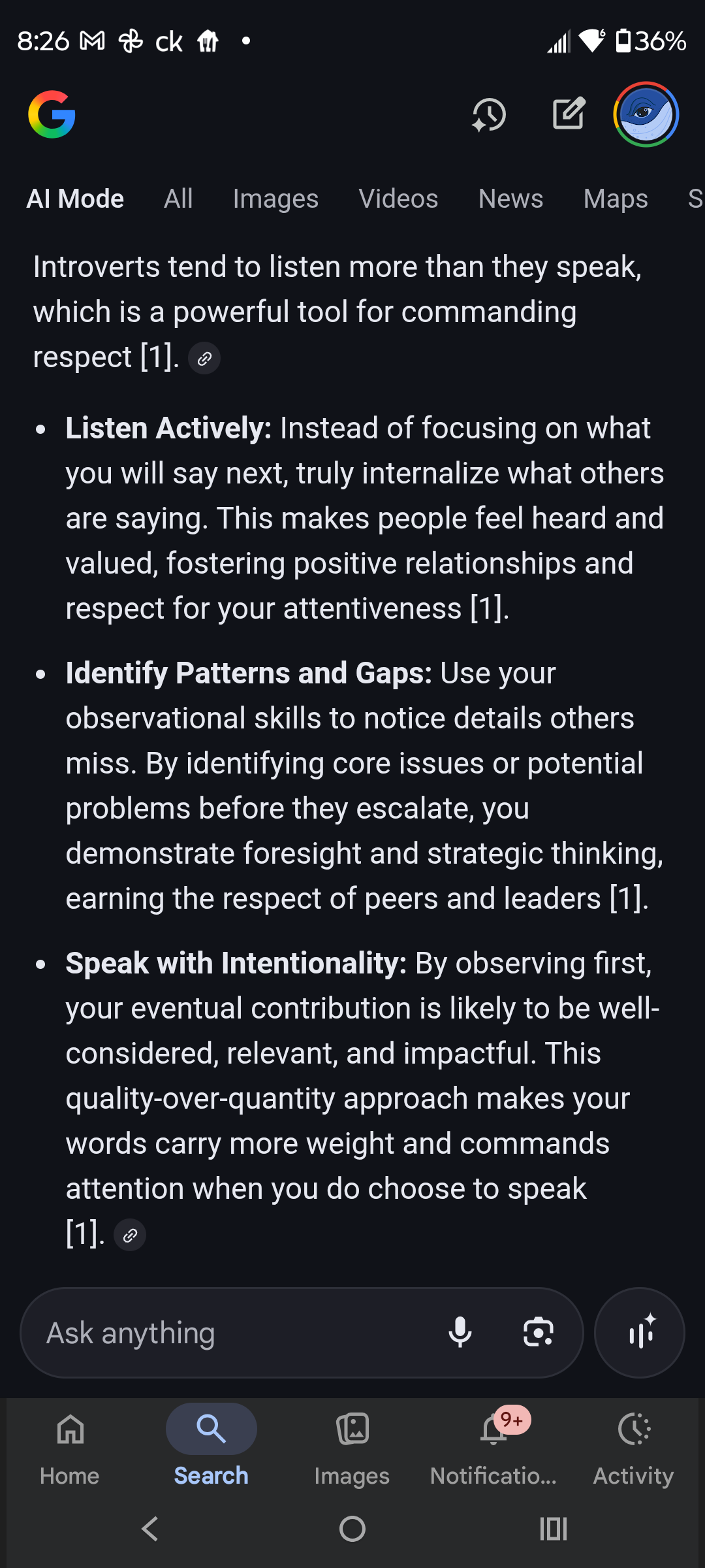 Thoughtful Observation. Listen with the intend to understand and observe with the aspiration to Intuit data you glean about other people based on Logic plus Observation. Watch. Learn. Then and only then can one begin to actively rather than listen in a way that resembles Attention Deficit Processing Disorders. Respect of Self is essential for mastering Thought. One can actively think without engaging with others. As such, to improve quality of mind and communication, seek to control one’s mind and to focus on neural task as hand if seeking to have meaningful and high quality interactions with others.