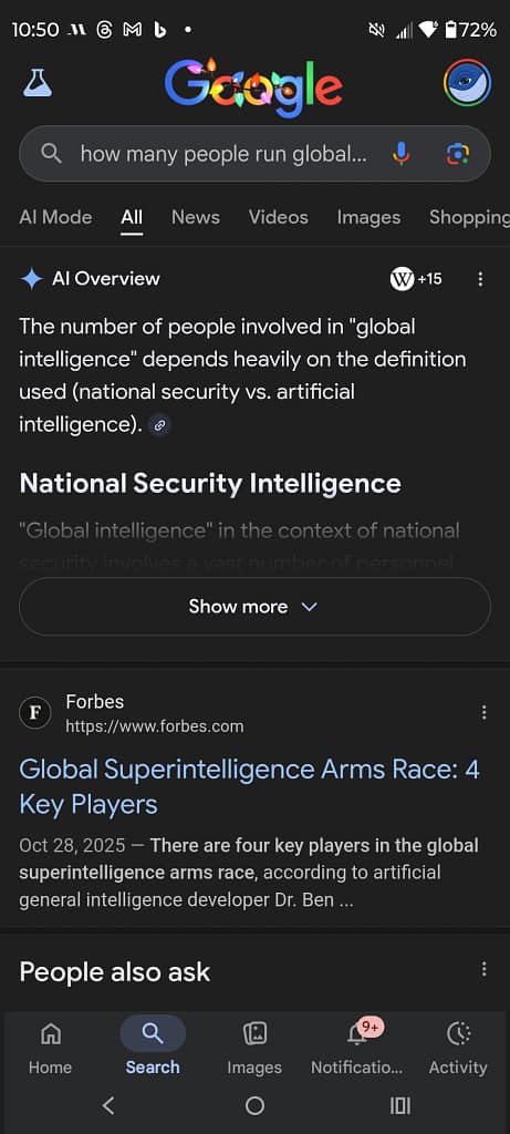 Ever wonder and ask yourself or a computer the question, “How many people run global intelligence?” As of December 20, 2025 AD AD this was the response when we asked the team from Google while we worked on the Google Moonshot Project from out in the actual field.